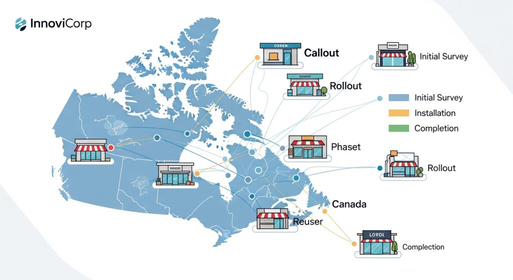 At InnoviCorp, we specialize in executing smooth, scalable, and detail-driven program rollouts across Canada. Whether you’re launching new store displays, updating brand elements, or coordinating multi-location installations, we ensure every site is completed consistently, on time, and with full transparency.